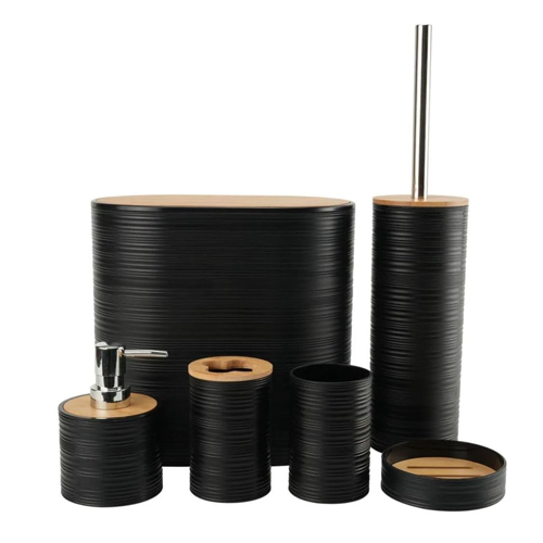 | قدّم المكونات المضمنة | سلة مهملات بيضاوية بغطاء من الخيزران، فرشاة استحمام مع قاعدة، موزع صابون، حامل فرشاة أسنان، صحن صابون، صينية تنظيمسلة مهملات بيضاوية بغطاء من الخيزران، فرشاة استحمام مع قاعدة، موزع صابون، حامل فرشاة أسنان، صحن صابون، صينية تنظيم |