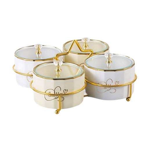 • تصميم أنيق: طقم تقديم مكسرات بورسلين مكون من أربع قطع مع حامل ستيل ذهبي فاخر، مثالي لتسلية الضيوف والمناسبات الخاصة